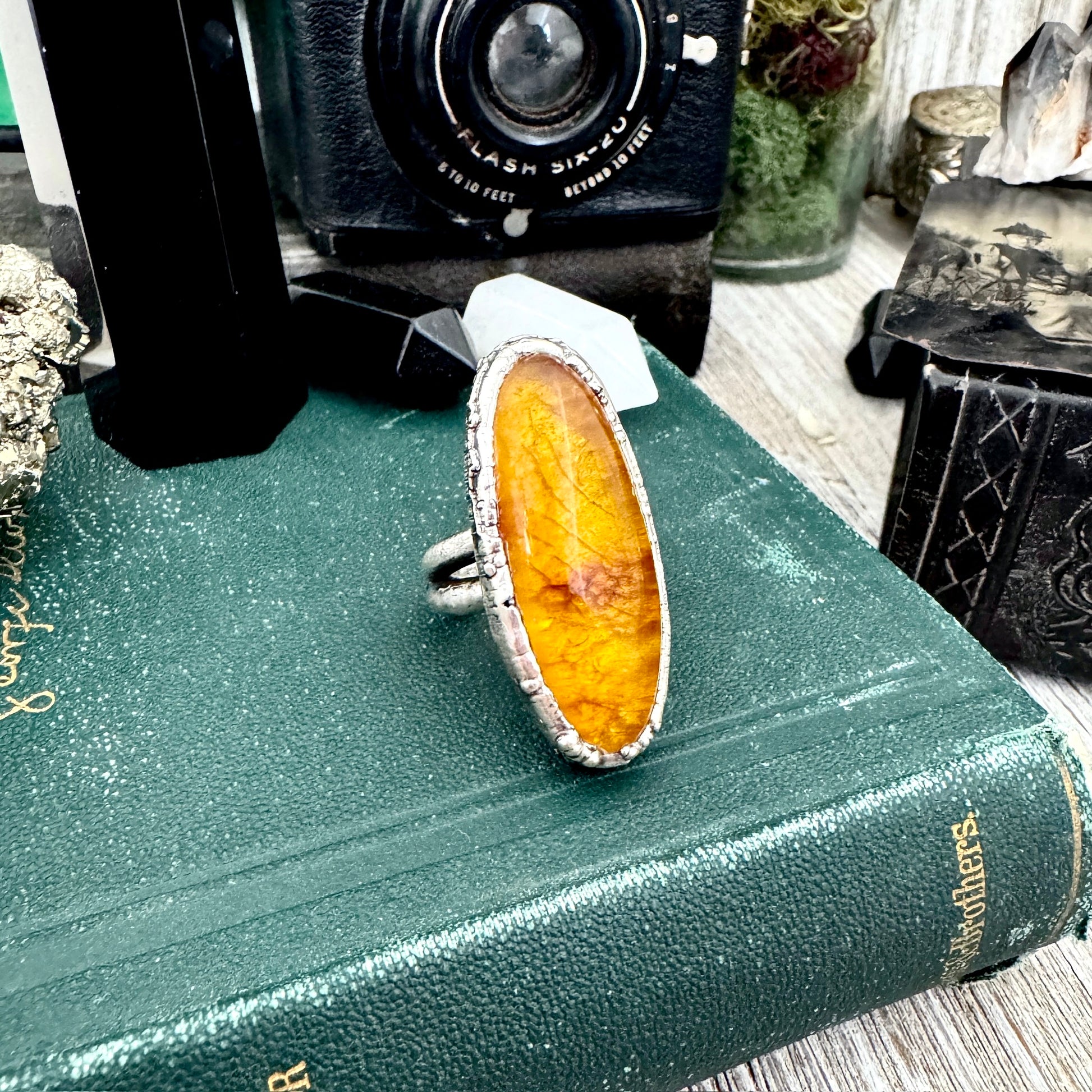 Get in touch with our contact page or you can always contact us on our FOXLARK Instagram www.instagram.com/foxlark or Facebook pages www.Facebook.com/foxlark , or through email foxlarkalchemy@gmail.comSlip a little magic onto your hand with this Baltic Amber fine silver ring. Sleek yet powerful, it radiates with energy, making it the perfect piece for anyone who loves a touch of power with their mysticism.