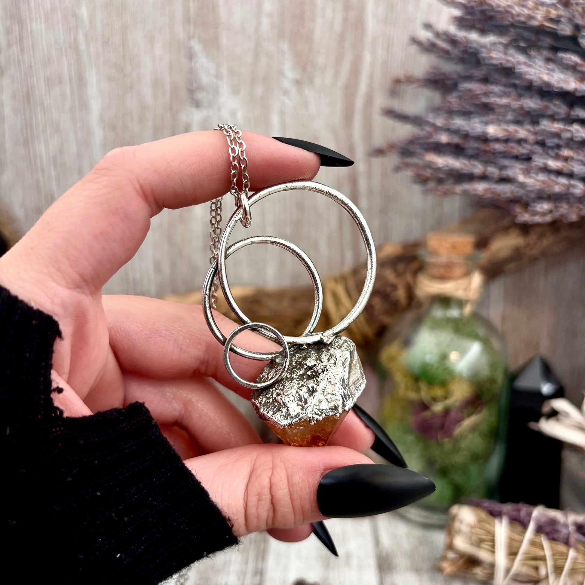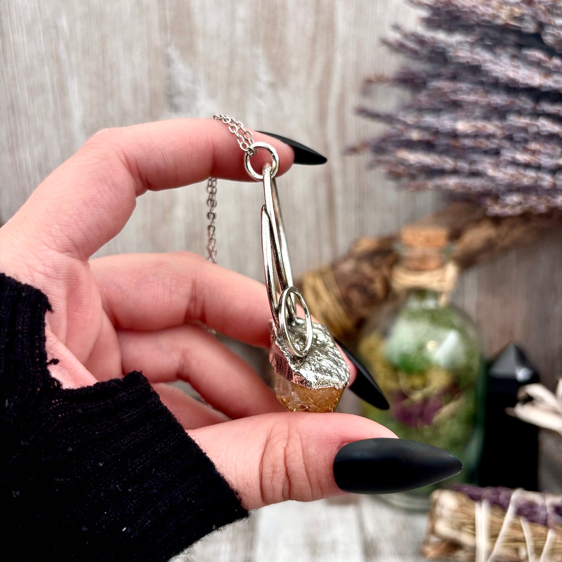 Get in touch with our contact page or you can always contact us on our FOXLARK Instagram www.instagram.com/foxlark or Facebook pages www.Facebook.com/foxlark , or through email foxlarkalchemy@gmail.comThis necklace features a Citrine crystal set in fine silver. Known for its uplifting energy, Citrine attracts abundance, positivity, and confidence. Designed for those with an alternative style, it adds a vibrant touch while supporting manifestation and personal growth.