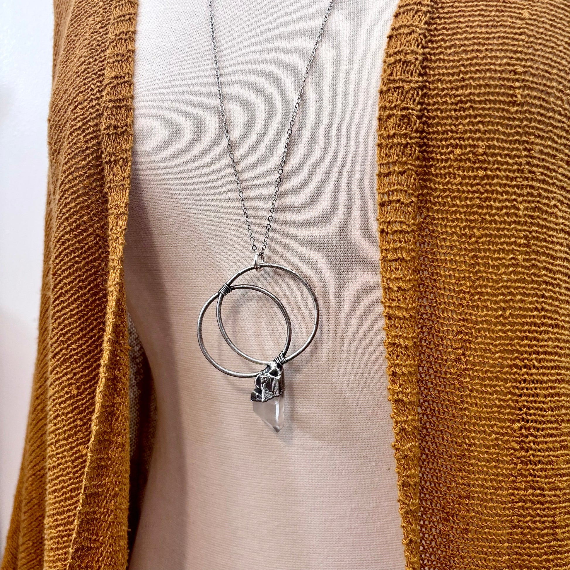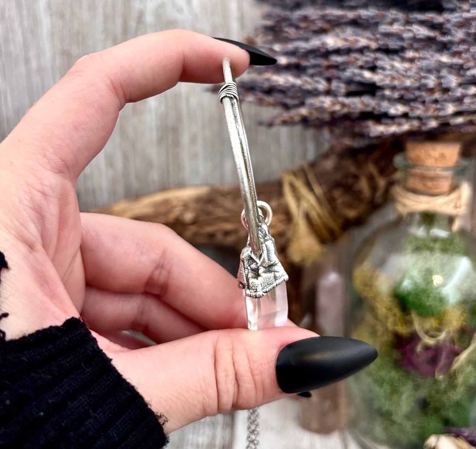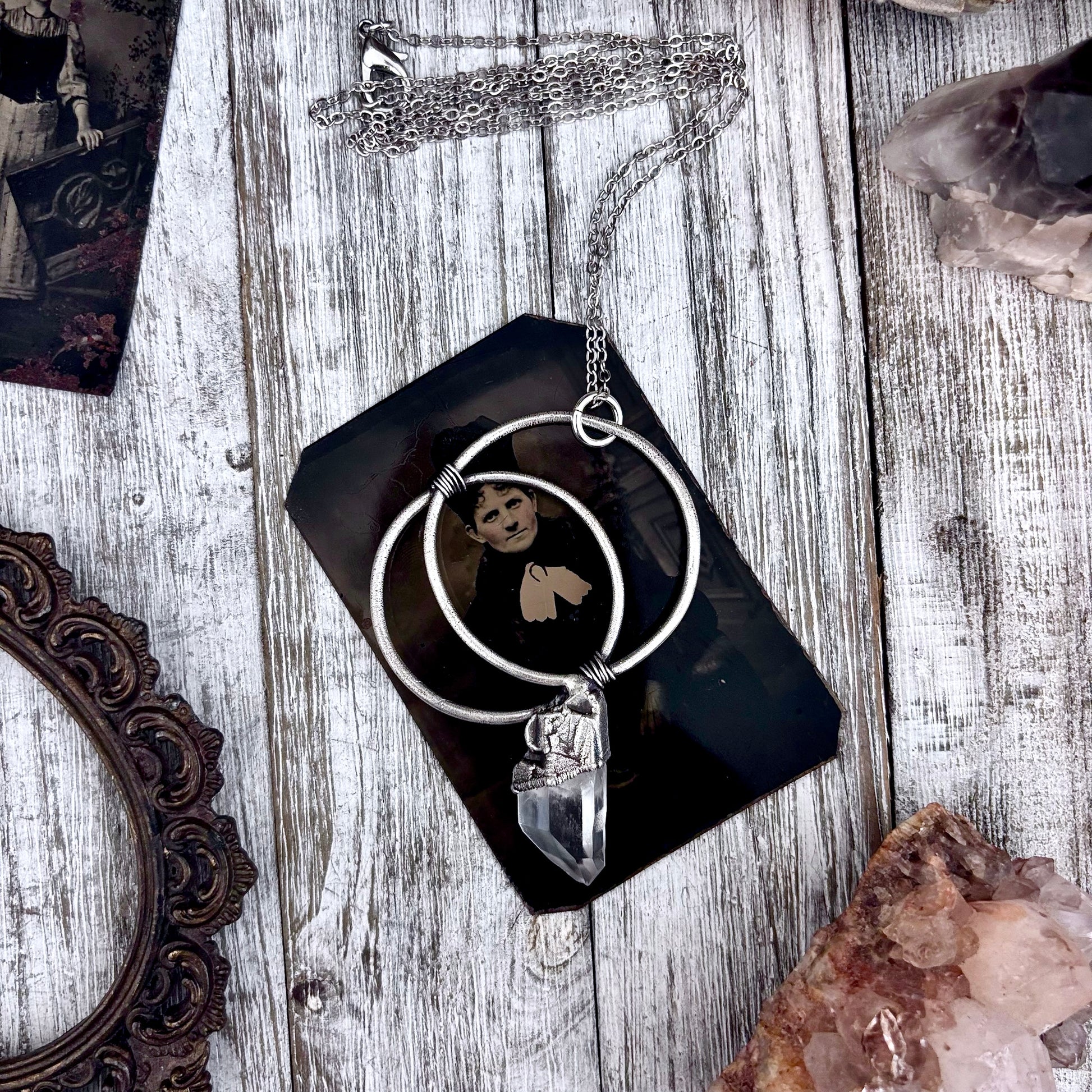 Get in touch with our contact page or you can always contact us on our FOXLARK Instagram www.instagram.com/foxlark or Facebook pages www.Facebook.com/foxlark , or through email foxlarkalchemy@gmail.comThis necklace features a Clear Quartz crystal set in fine silver. Known as the master healer, Clear Quartz enhances clarity, energy, and intention. Designed for those with an alternative style, it adds a sleek touch while supporting spiritual growth and focus.