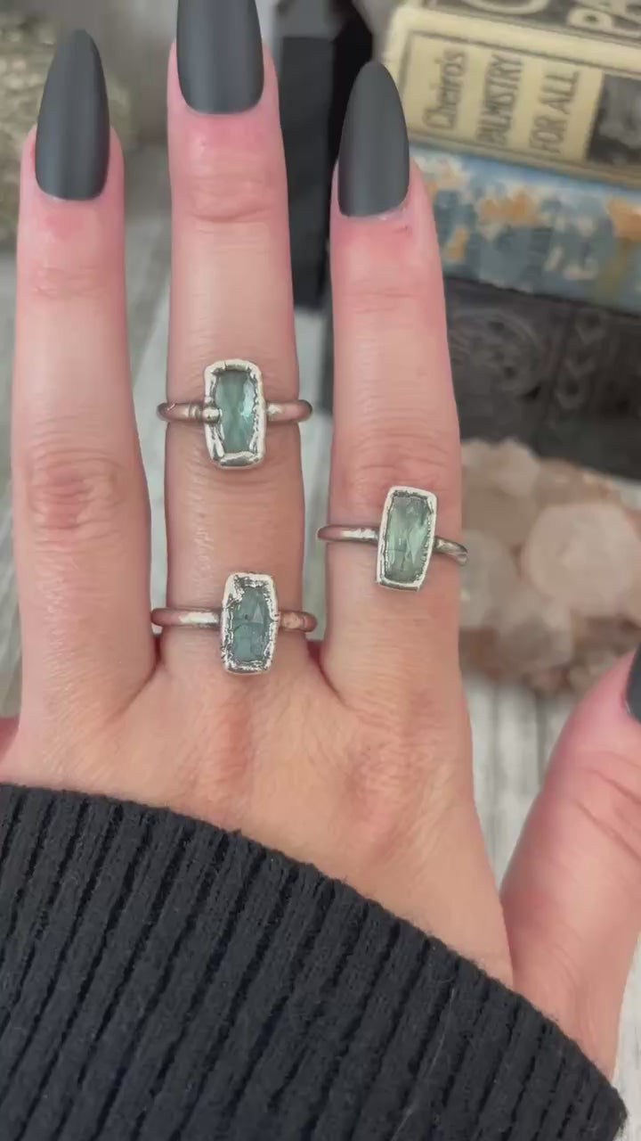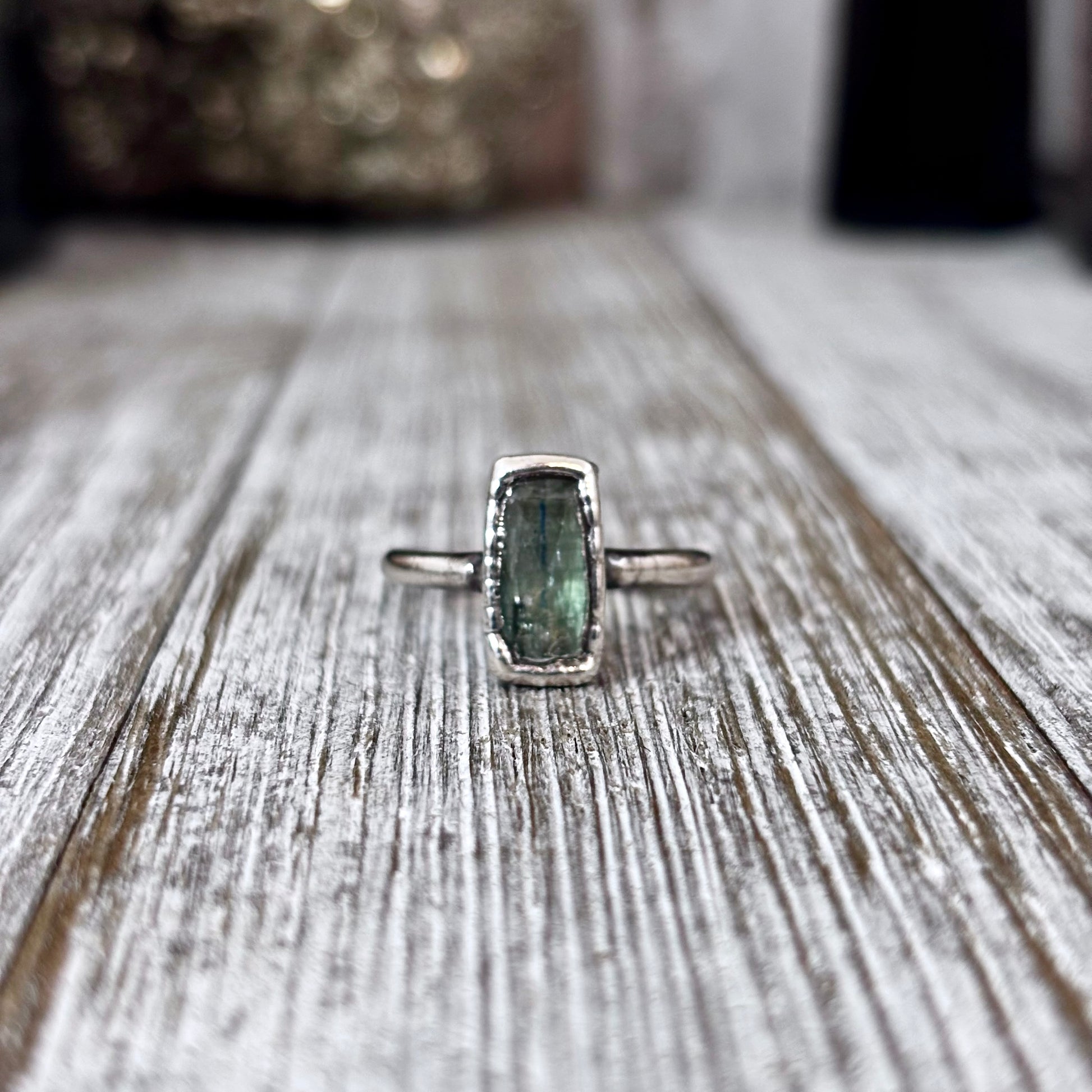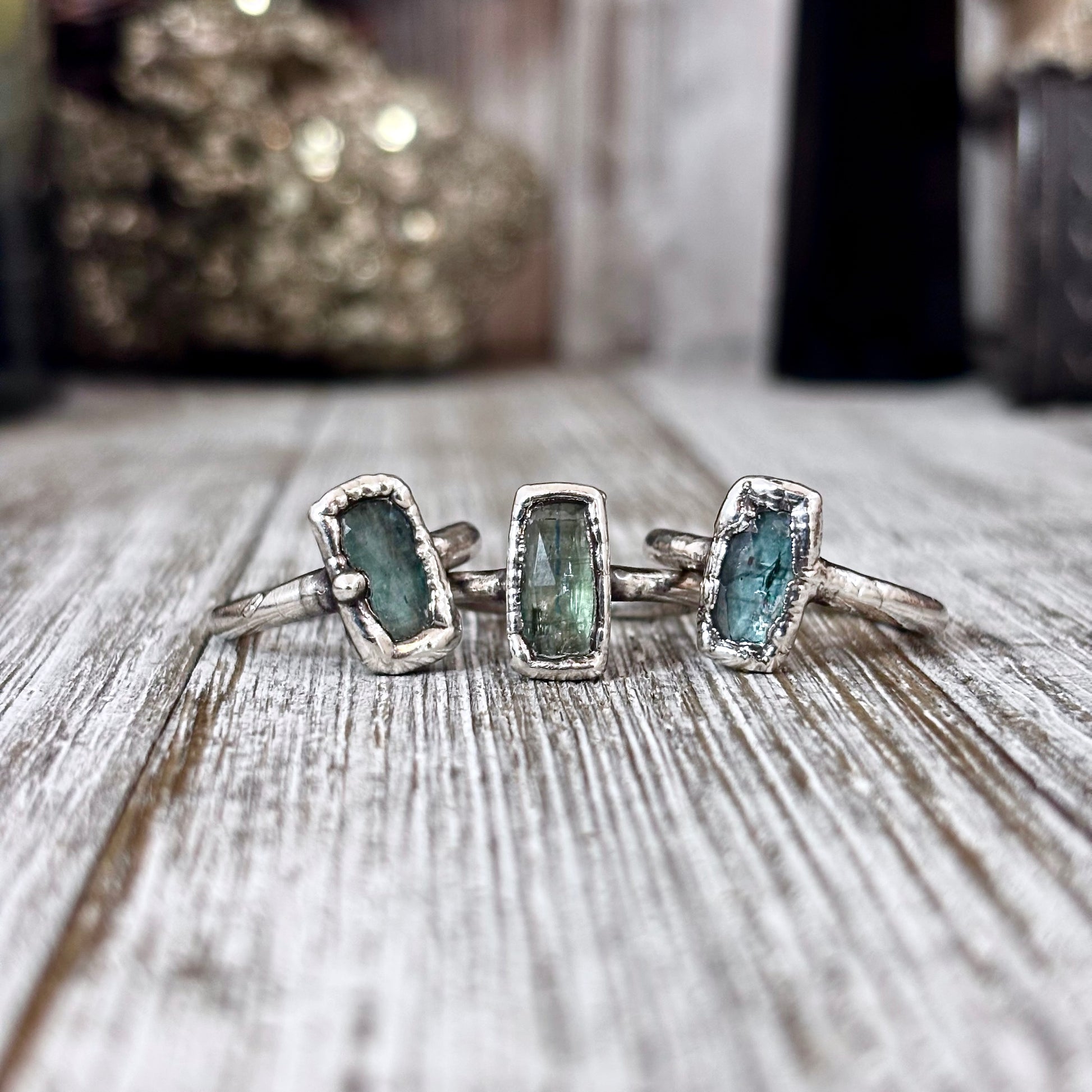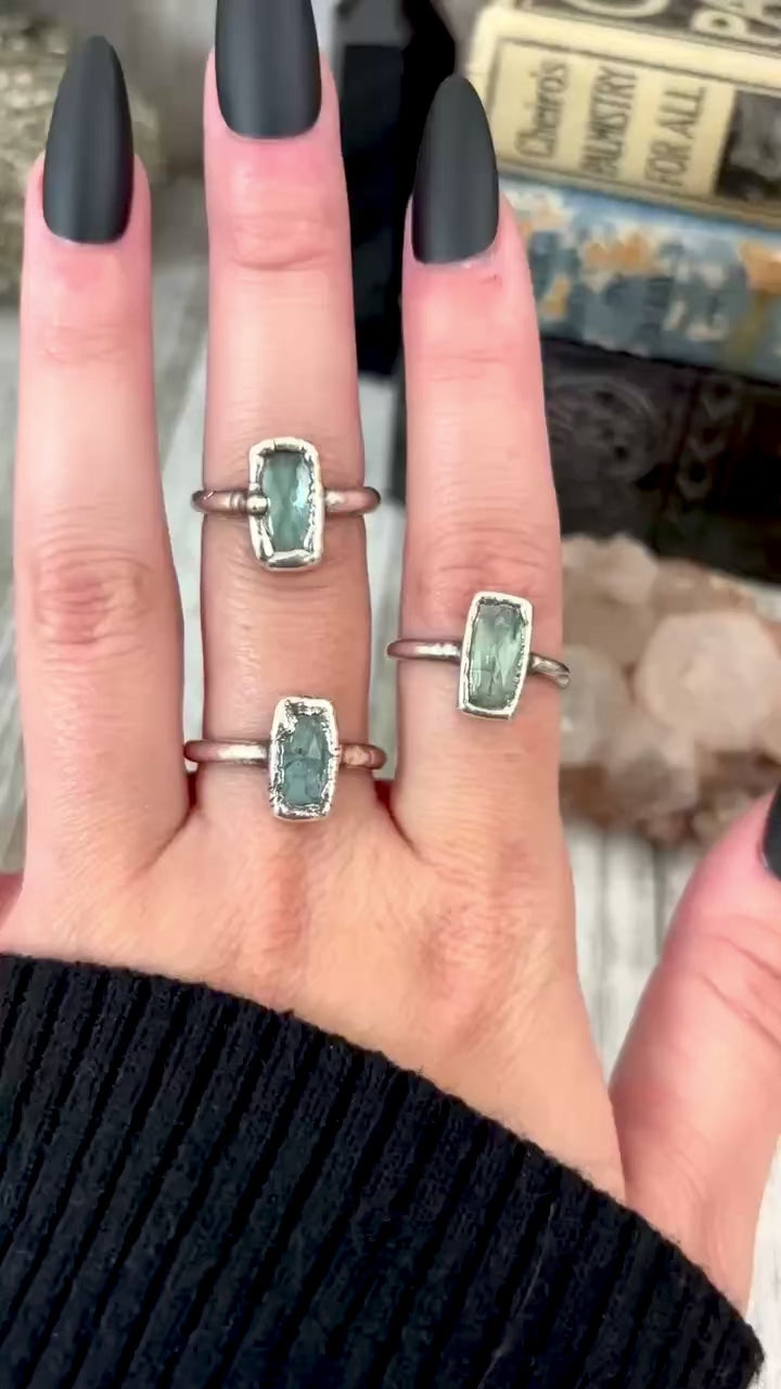 Get in touch with our contact page or you can always contact us on our FOXLARK Instagram www.instagram.com/foxlark or Facebook pages www.Facebook.com/foxlark , or through email foxlarkalchemy@gmail.comThis dainty Blue Kyanite ring, set in fine silver, brings a sleek, ethereal edge to your everyday style. Known for its shimmering striations and calming energy, it channels clarity, alignment, and inner peace. Cool, clear, and quietly powerful—perfect for those who move through the world with intention and grace.