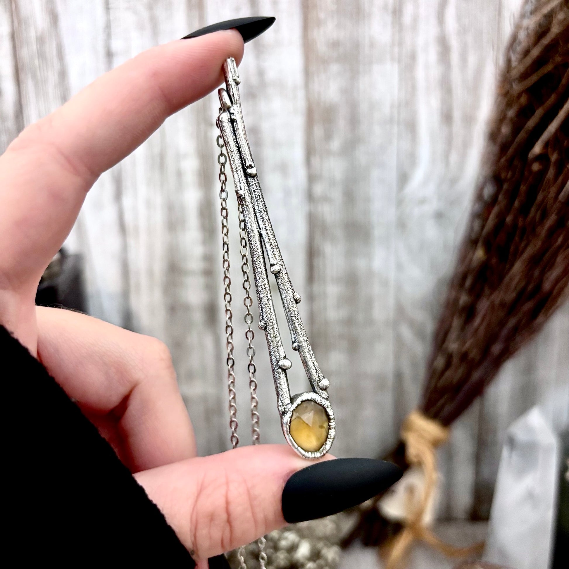 Get in touch with our contact page or you can always contact us on our FOXLARK Instagram www.instagram.com/foxlark or Facebook pages www.Facebook.com/foxlark , or through email foxlarkalchemy@gmail.comEarthy, layered, and full of natural magic—this fine silver necklace frames citrine in hand-formed twigs, capturing the grounding beauty of the earth in a striking crystal statement piece.