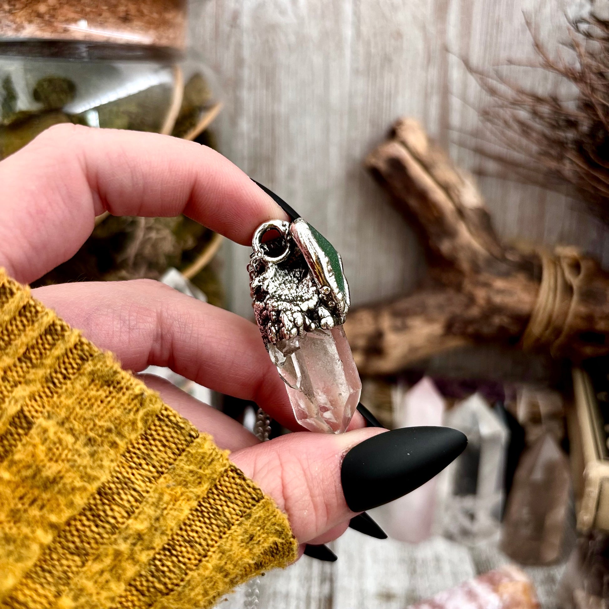 Get in touch with our contact page or you can always contact us on our FOXLARK Instagram www.instagram.com/foxlark or Facebook pages www.Facebook.com/foxlark , or through email foxlarkalchemy@gmail.comClear Quartz & Green Sea Glass Crystal Statement Necklace in Fine Silver / Foxlark Collection - One of a Kind