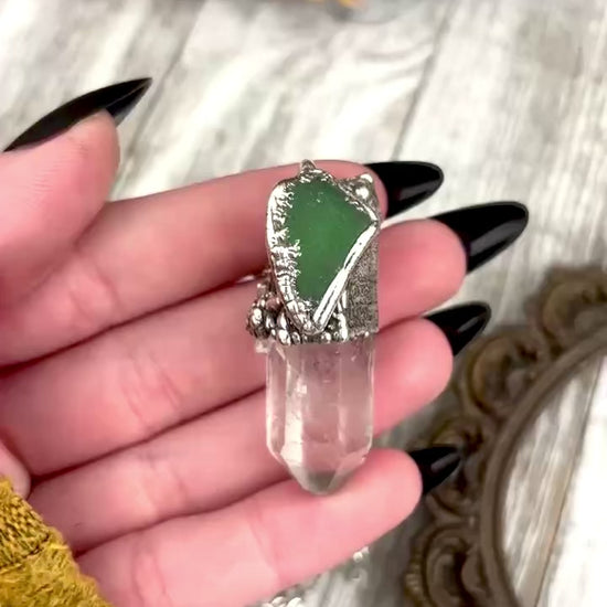 Clear Quartz & Green Sea Glass Crystal Statement Necklace in Fine Silver / Foxlark Collection - One of a Kind