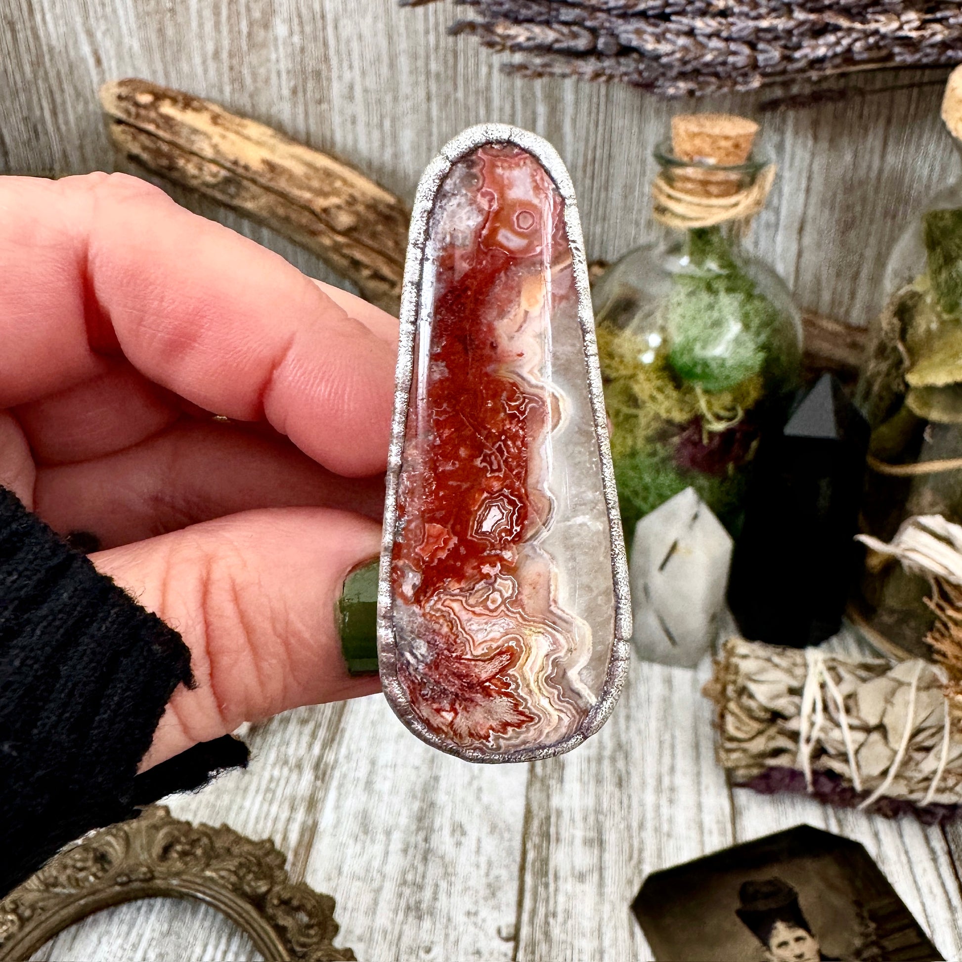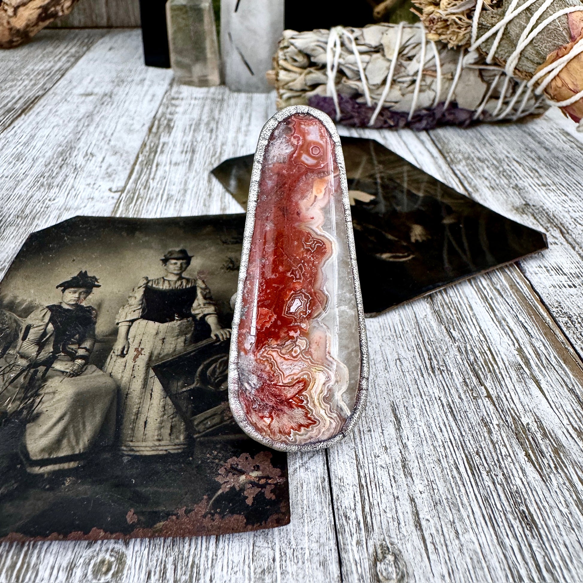 Get in touch with our contact page or you can always contact us on our FOXLARK Instagram www.instagram.com/foxlark or Facebook pages www.Facebook.com/foxlark , or through email foxlarkalchemy@gmail.comThis ring features a Crazy Lace Agate crystal set in fine silver. Known for its uplifting energy, Crazy Lace Agate promotes joy, balance, and resilience. Designed for those with an alternative style, it adds a bold touch while supporting positivity and inner strength.