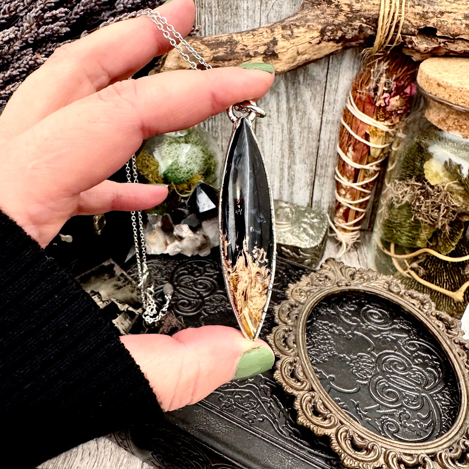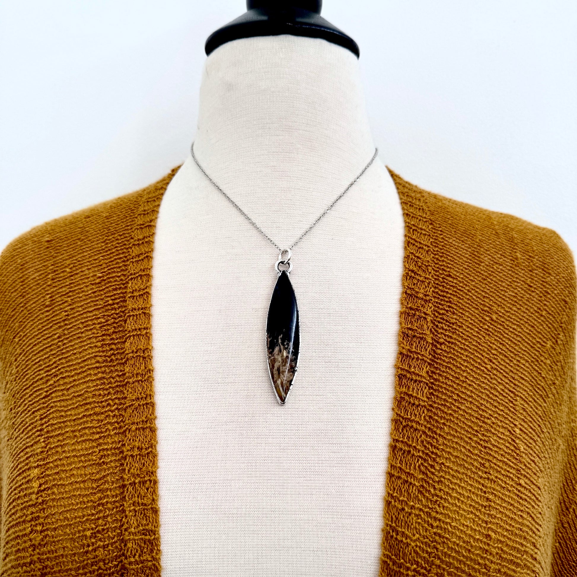 Get in touch with our contact page or you can always contact us on our FOXLARK Instagram www.instagram.com/foxlark or Facebook pages www.Facebook.com/foxlark , or through email foxlarkalchemy@gmail.comPendant measures roughly 2.8" in length and hangs on a 16" silver rhodium plated chain with a 2" extender chain. (Rhodium jewelry is nickel-free, which makes it hypoallergenic). *If you would like a different length chain just let me know,