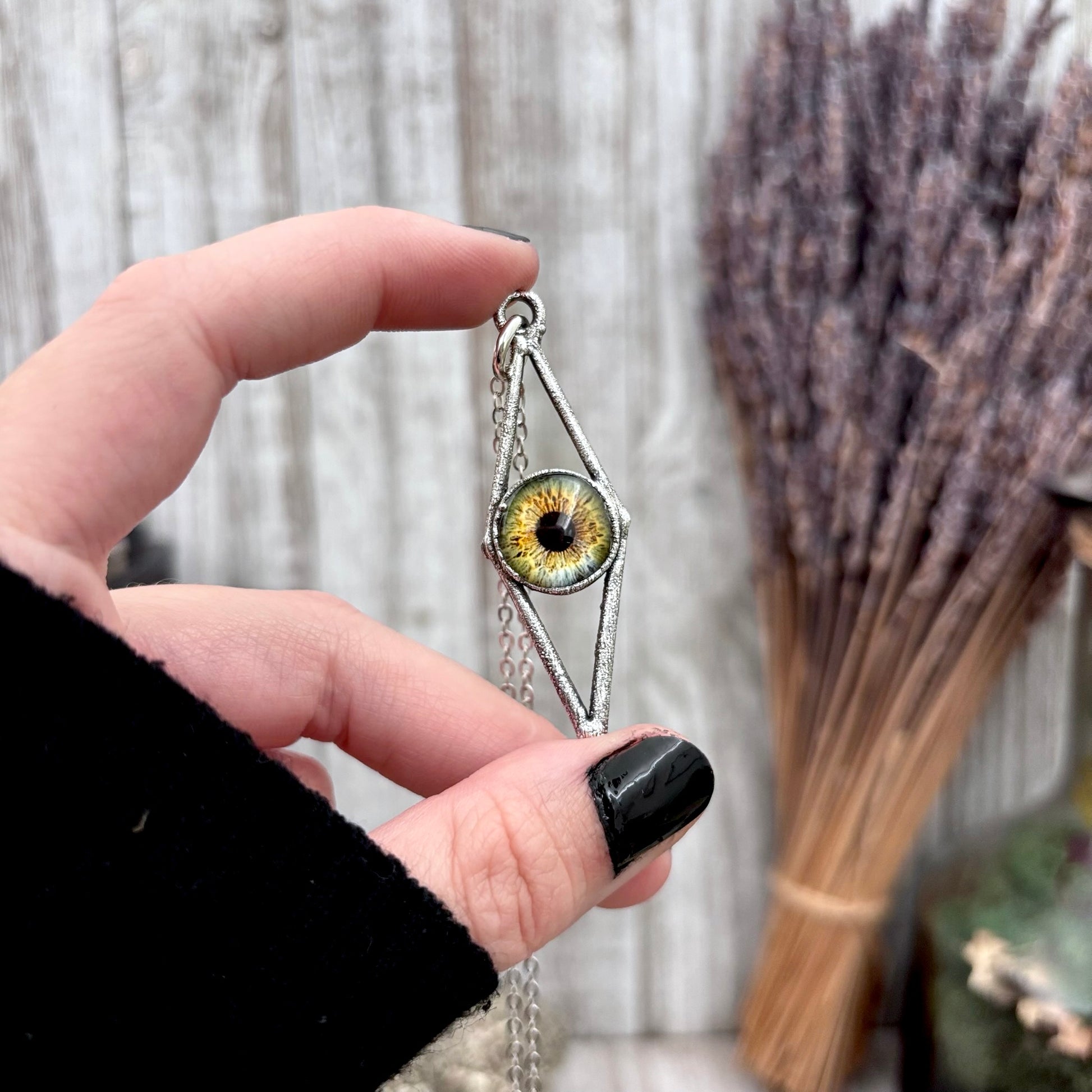 Get in touch with our contact page or you can always contact us on our FOXLARK Instagram www.instagram.com/foxlark or Facebook pages www.Facebook.com/foxlark , or through email foxlarkalchemy@gmail.comEyeball necklace set in fine silver and given a vintage patina turning it into a unique statement necklace. This handmade necklace is perfect worn alone or layered with other pieces.