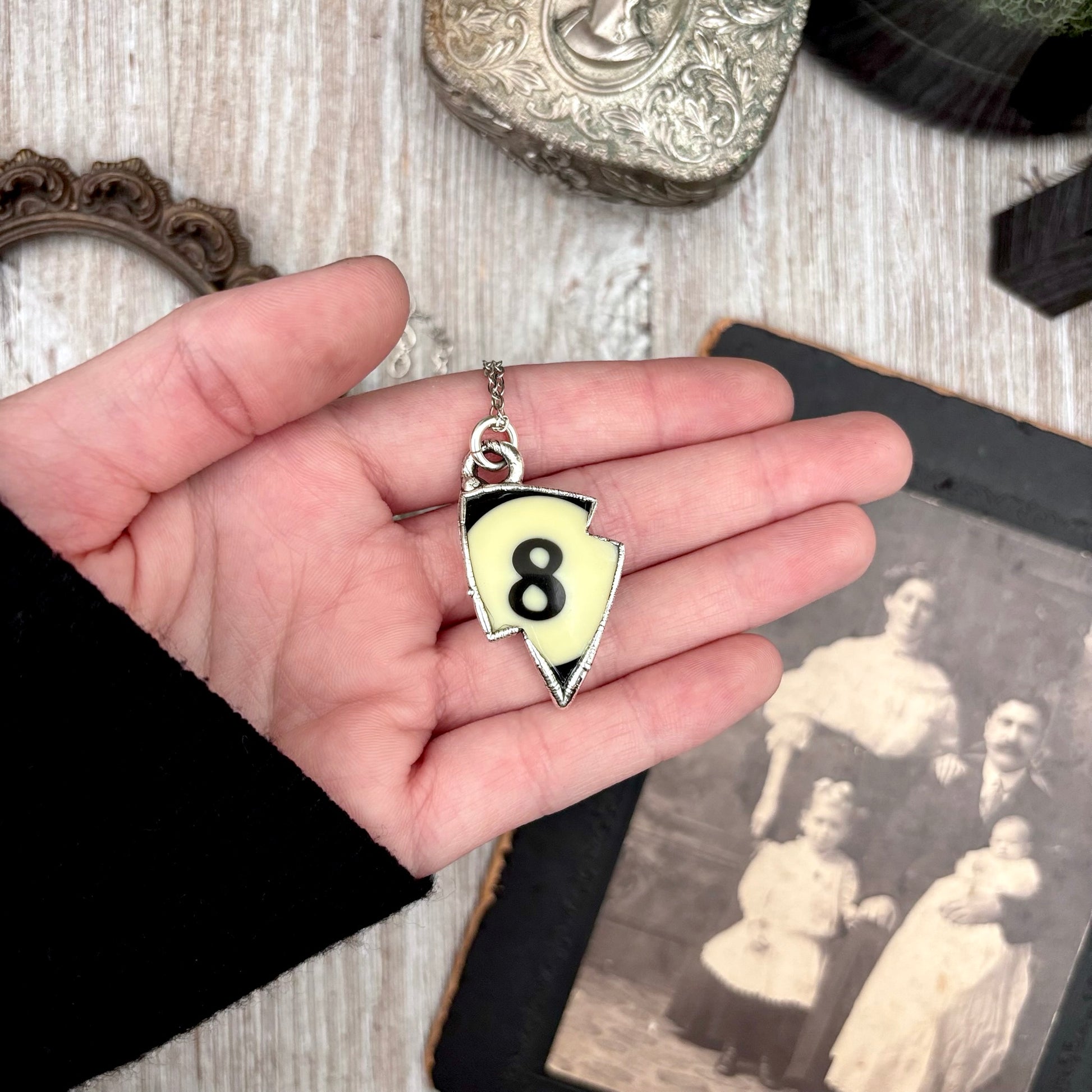 Get in touch with our contact page or you can always contact us on our FOXLARK Instagram www.instagram.com/foxlark or Facebook pages www.Facebook.com/foxlark , or through email foxlarkalchemy@gmail.com#8 Pool Ball set in fine silver and given a vintage patina turning it into a unique statement necklace. This handmade necklace is perfect worn alone or layered with other pieces.