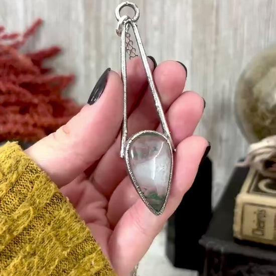 Get in touch with our contact page or you can always contact us on our FOXLARK Instagram www.instagram.com/foxlark or Facebook pages www.Facebook.com/foxlark , or through email foxlarkalchemy@gmail.comMoss Agate set in fine silver and given a vintage patina turning it into a unique crystal statement necklace. This handmade crystal necklace is perfect worn alone or layered with with other pieces.
