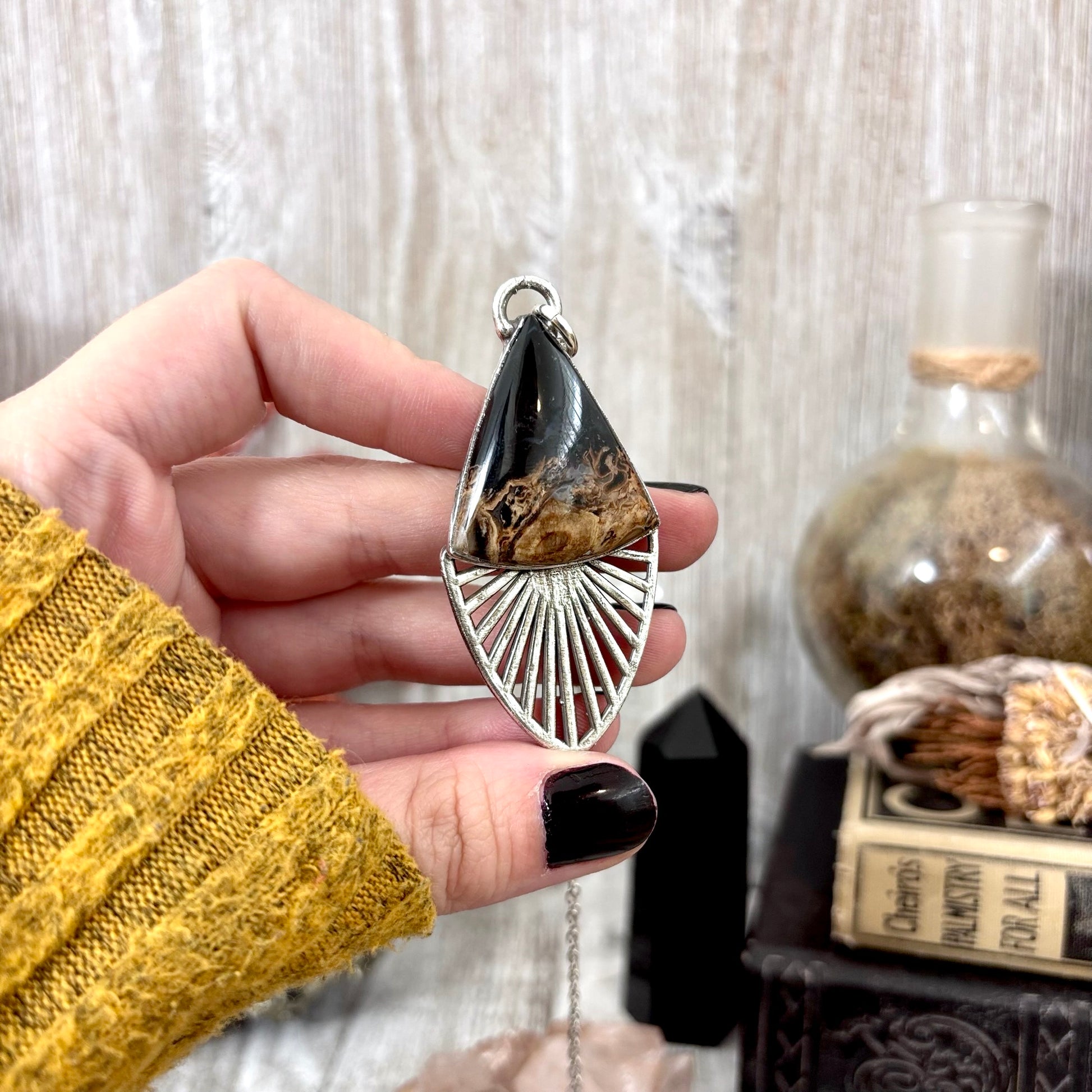 Fossilized Palm Root set in fine silver and given a vintage patina turning it into a unique crystal statement necklace. This handmade crystal necklace is perfect worn alone or layered with with other pieces.