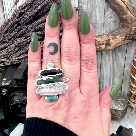 Multi Stone Turquoise Black Onyx Moss Agate & Clear Quartz Ring In Fine Silver Size 8 / Foxlark Collection