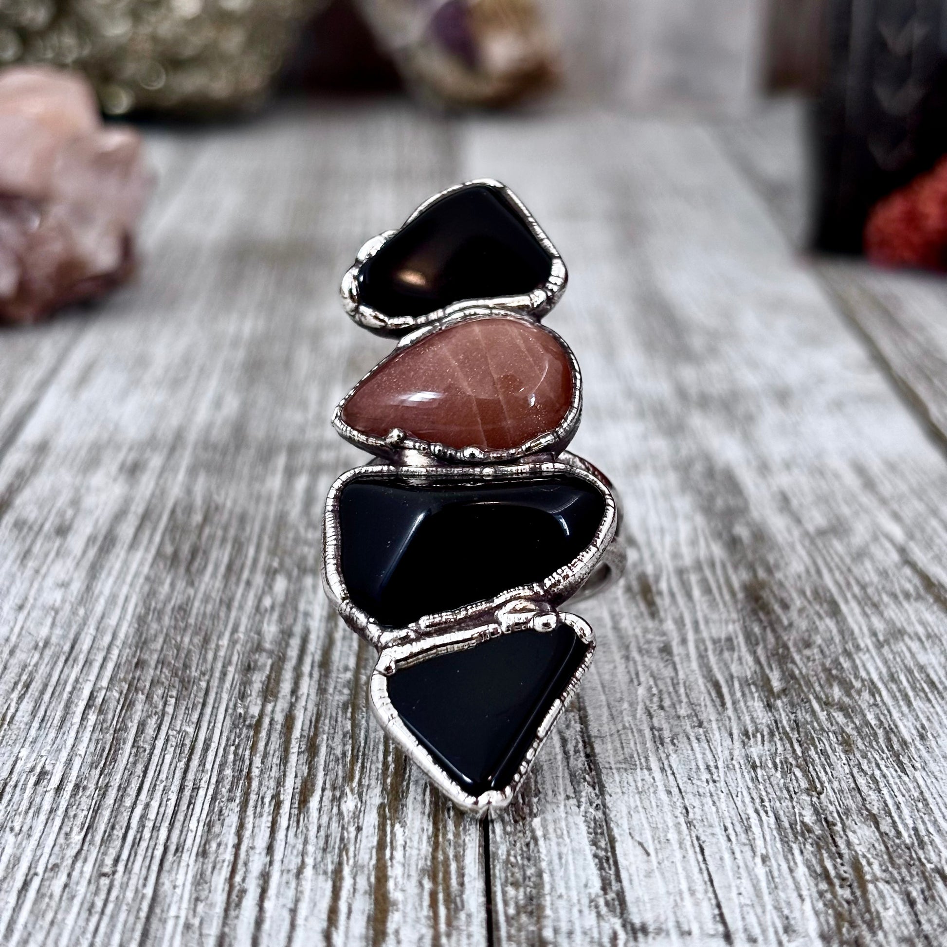 Multi Stone Black Obsidian Sun Stone Ring In Silver Size 10 / Foxlark Collection