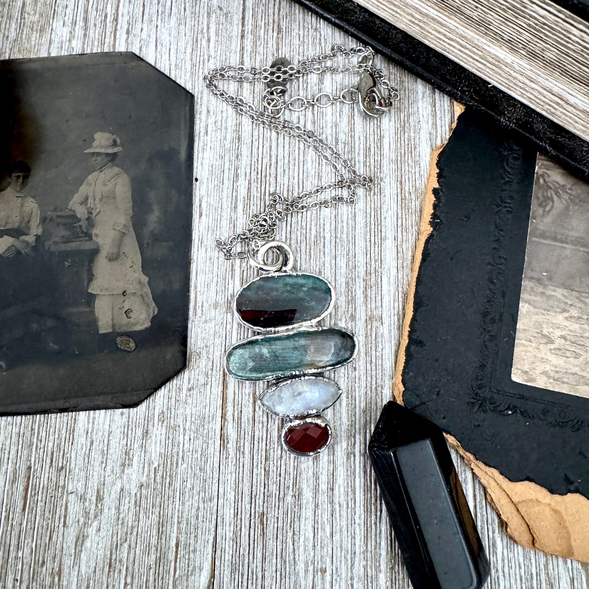 Get in touch with our contact page or you can always contact us on our FOXLARK Instagram www.instagram.com/foxlark or Facebook pages www.Facebook.com/foxlark , or through email foxlarkalchemy@gmail.comBloodstone, labradorite, moonstone, and garnet in fine silver and given a vintage patina turning it into a unique crystal statement necklace. This handmade crystal necklace is perfect worn alone or layered with with other pieces.
