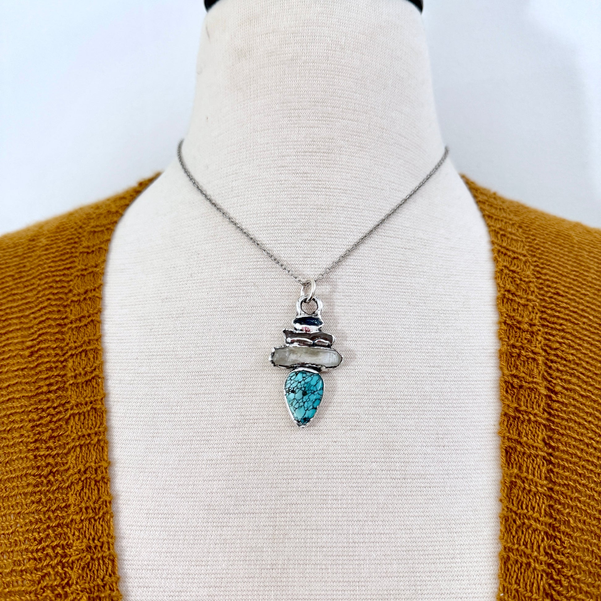 Multi Stone Blue Kyanite Raw Clear Quartz Turquoise Necklace Silver / Foxlark Collection