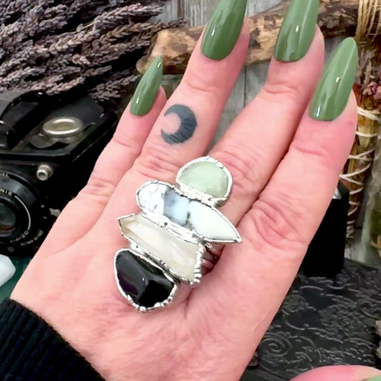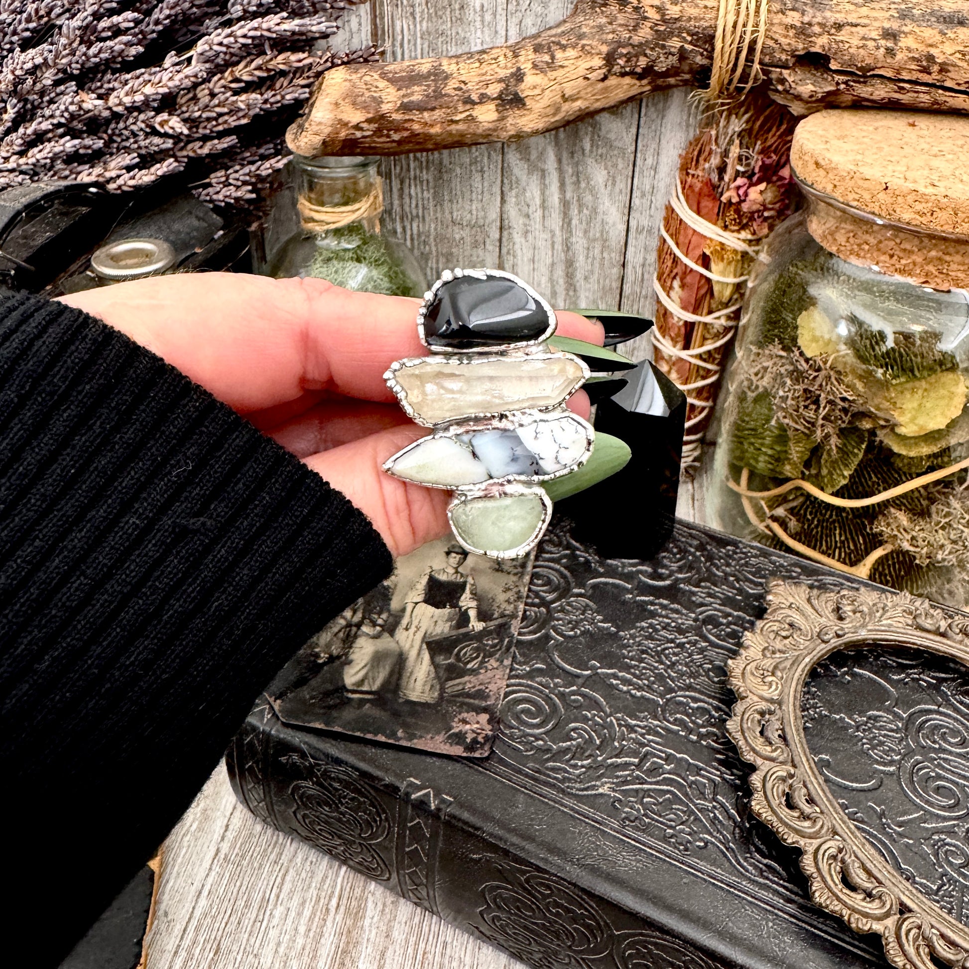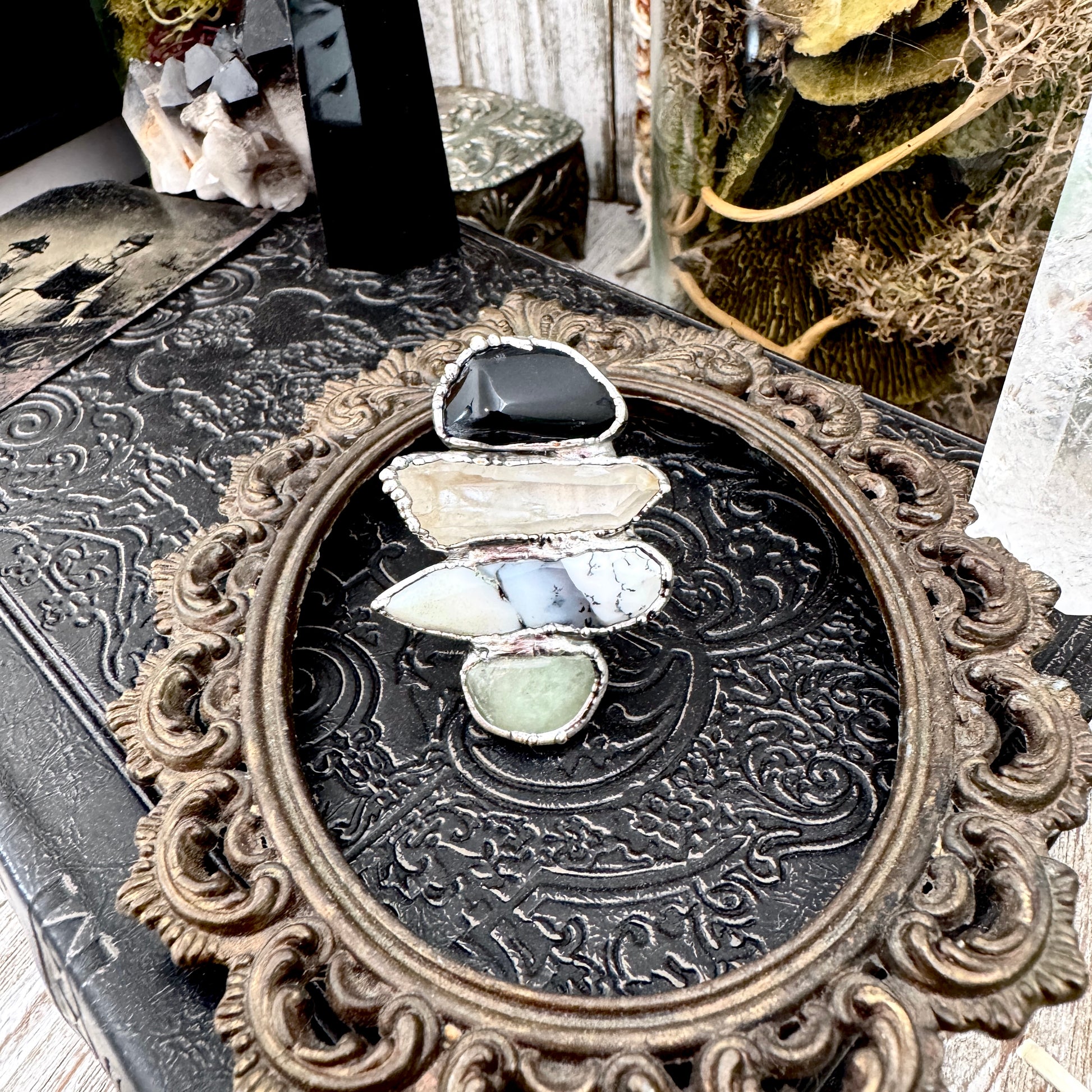 Multi Stone Black Onyx Clear Quartz Dendritic Agate & Amazonite Ring In Fine Silver Size 10.5 / Foxlark Collection