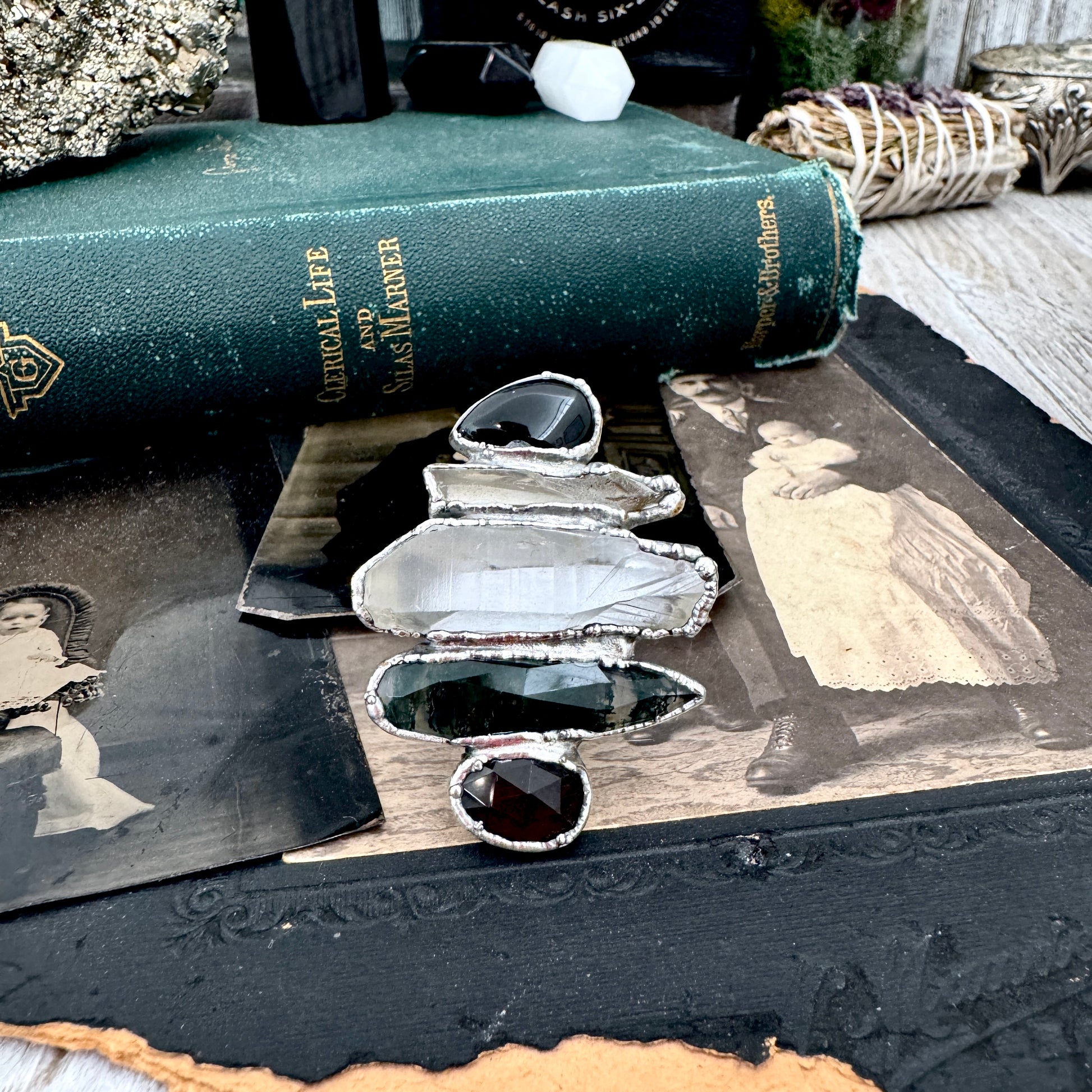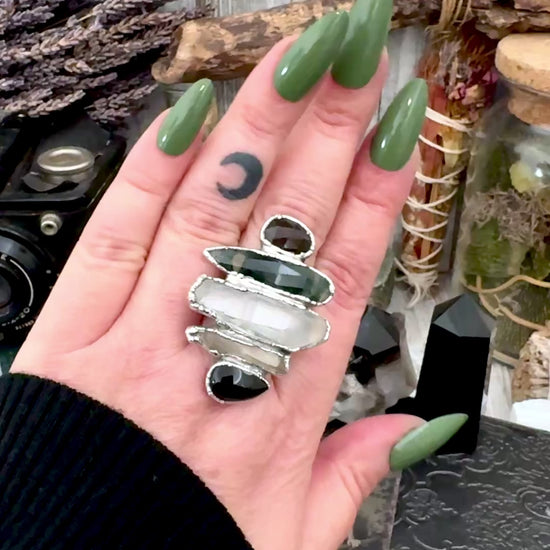 Multi Stone Black Obsidian Smoky Quartz Clear Quartz & Moss Agate Ring In Fine Silver Size 11 / Foxlark Collection