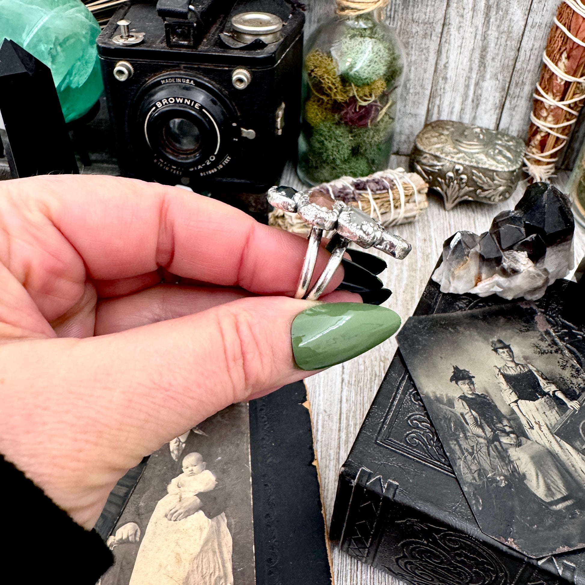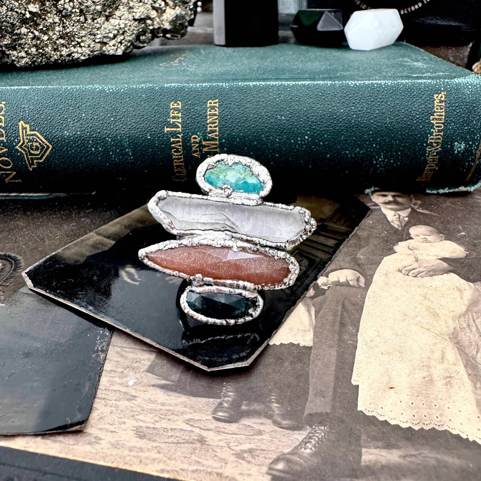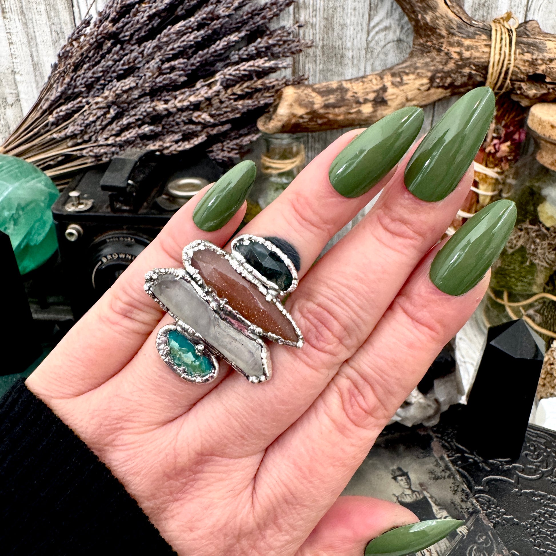 Get in touch with our contact page or you can always contact us on our FOXLARK Instagram www.instagram.com/foxlark or Facebook pages www.Facebook.com/foxlark , or through email foxlarkalchemy@gmail.comStacked, layered, and a little excessive in the best way. These multi stone rings are built from hand selected stones set in fine silver, each one completely one of a kind. Made for hands that don’t do subtle.