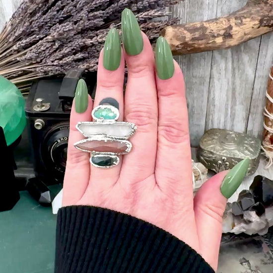 Multi Stone Moss Agate Peach Moonstone Clear Quartz & Turquoise Ring In Fine Silver Size 7 / Foxlark Collection