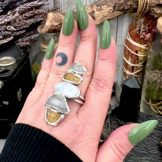 Multi Stone Clear Quartz Citrine & Rainbow Moonstone Ring In Fine Silver Size 10 / Foxlark Collection