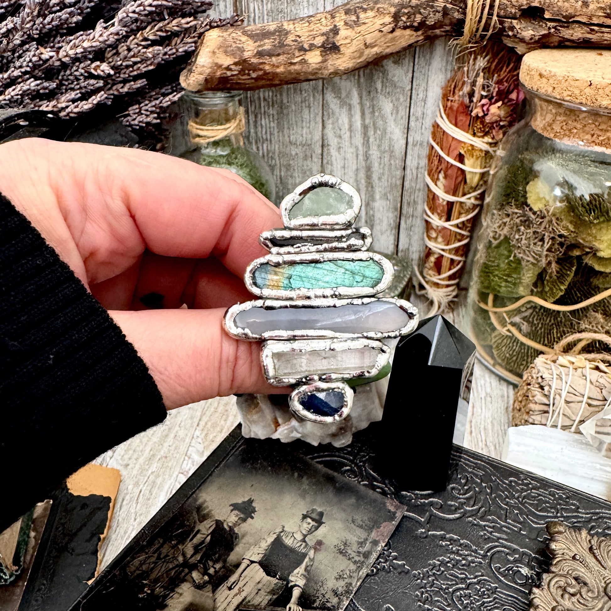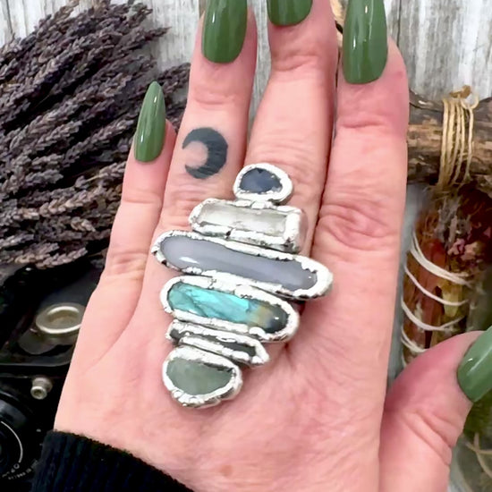 Multi Stone Amazonite Smoky Quartz Labradorite Blue Chalcedony Clear Quartz & Sapphire Ring In Fine Silver Size 9 / Foxlark Collection