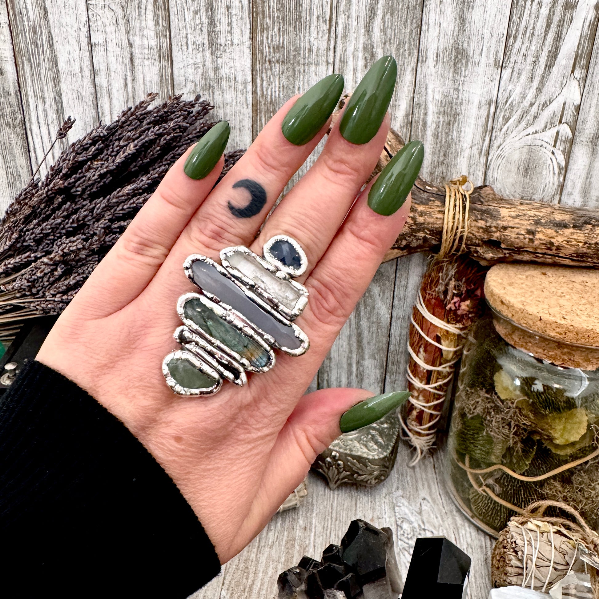 Stacked, layered, and a little excessive in the best way. These multi stone rings are built from hand selected stones set in fine silver, each one completely one of a kind. Made for hands that don’t do subtle.