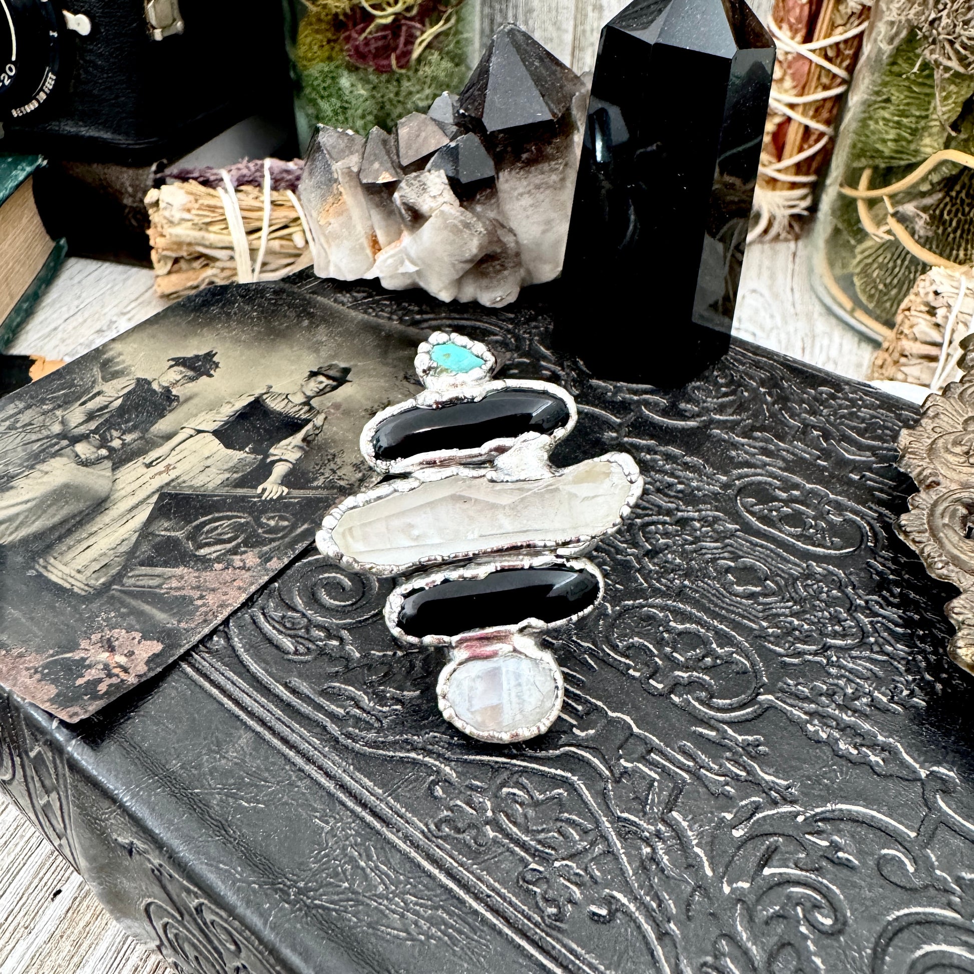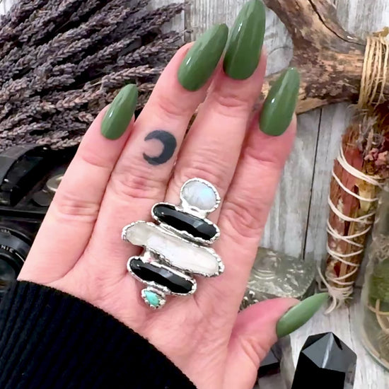 Multi Stone Turquoise Black Onyx Clear Quartz & Rainbow Moonstone Ring In Fine Silver Size 10 / Foxlark Collection
