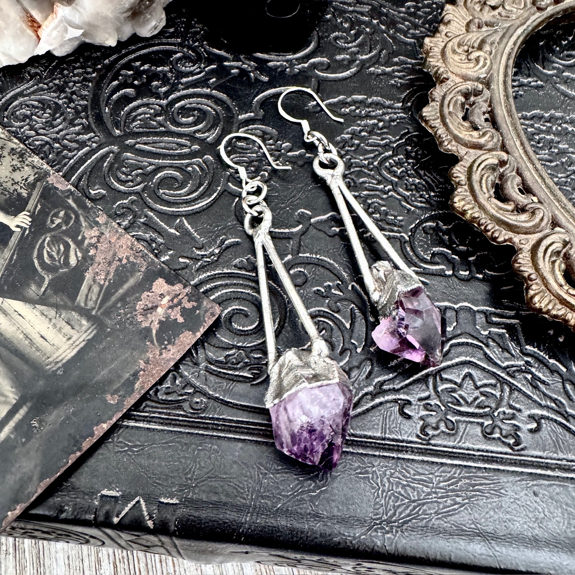 Raw Amethyst Fine Silver Crystal Dangle Earrings / Long Dangle Witchy Earrings