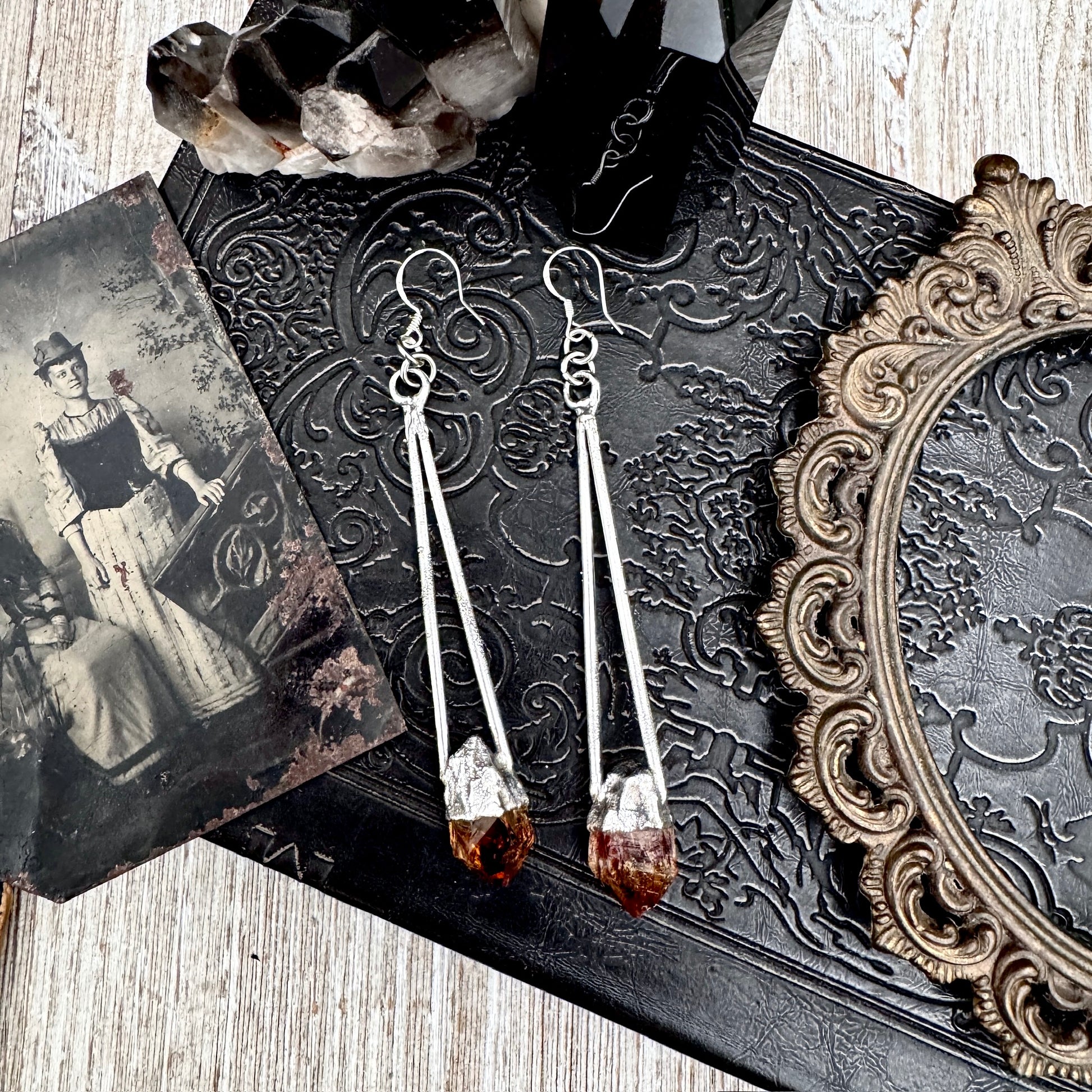 Raw Citrine Fine Silver Crystal Dangle Earrings / Long Dangle Witchy Earrings