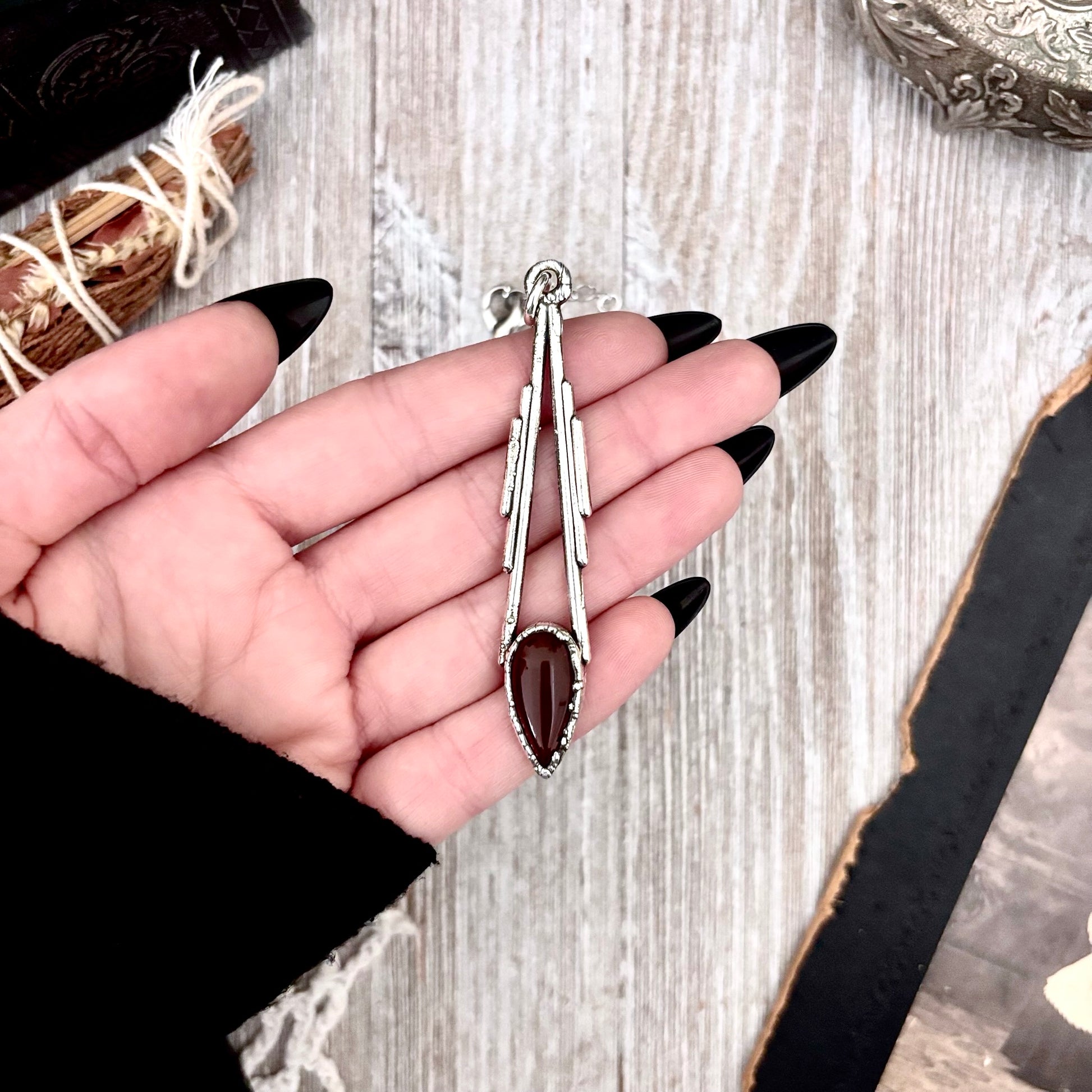 Get in touch with our contact page or you can always contact us on our FOXLARK Instagram www.instagram.com/foxlark or Facebook pages www.Facebook.com/foxlark , or through email foxlarkalchemy@gmail.comRed Carnelian set in fine silver and given a vintage patina turning it into a unique crystal statement necklace. This handmade crystal necklace is perfect worn alone or layered with with other pieces.