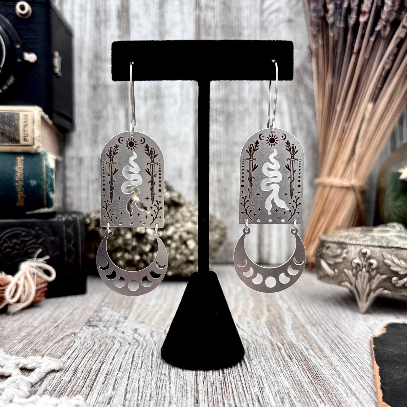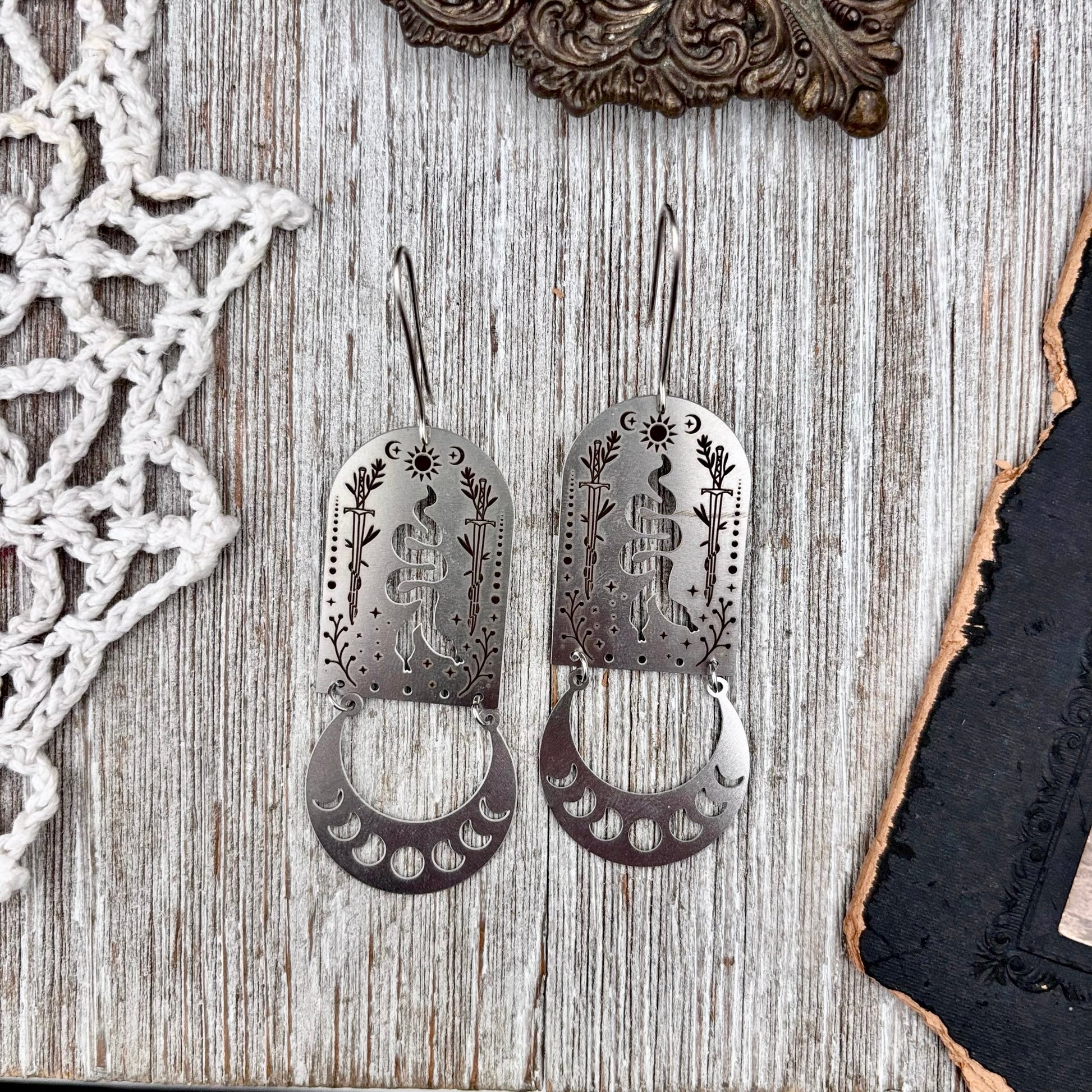 Stainless Steel Moon Phases Two Headed Snake Earrings / Long Dangle Earrings