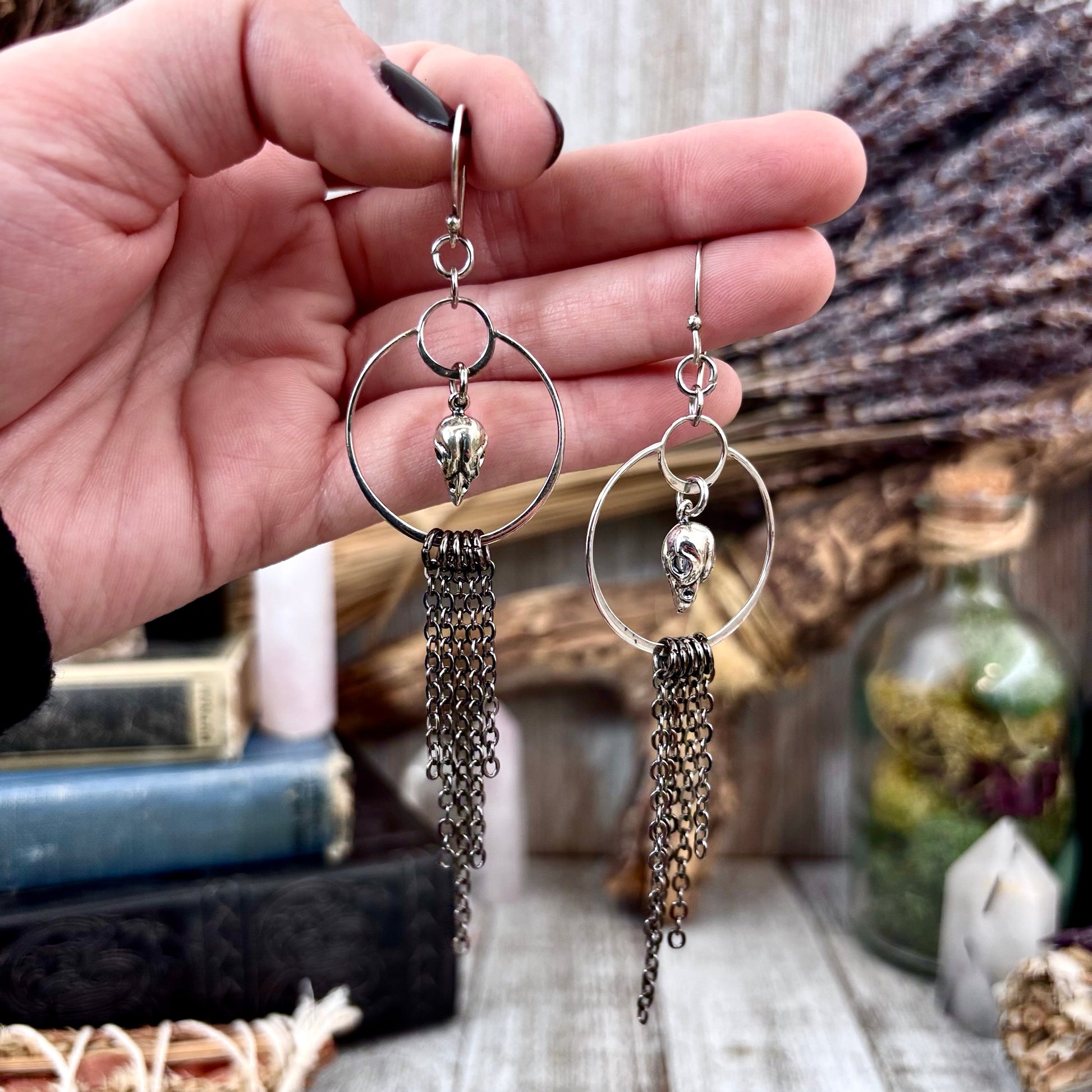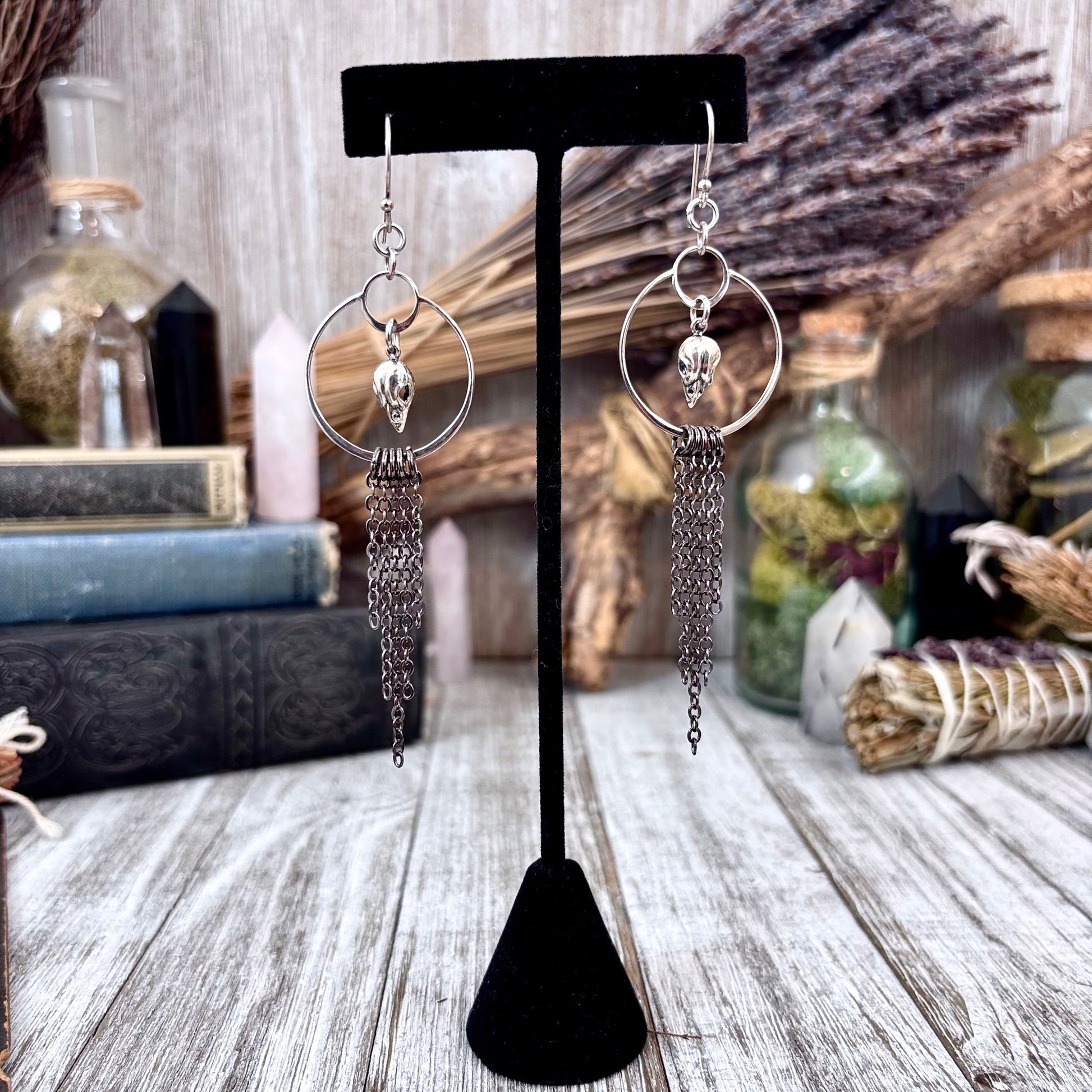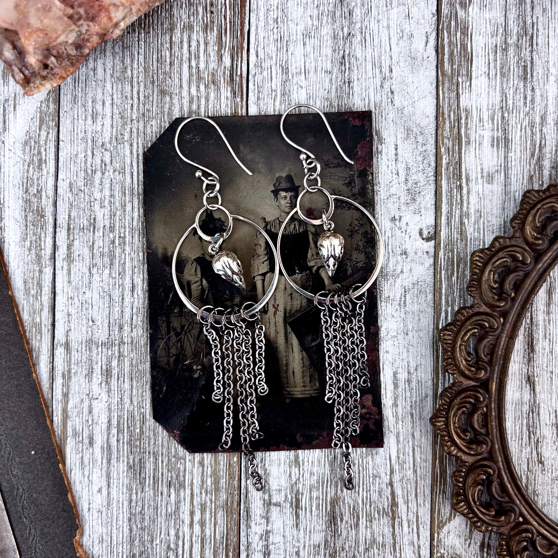 Sterling Silver Bird Skull Hoop Fringe Earrings / Long Dangle Witchy Earrings